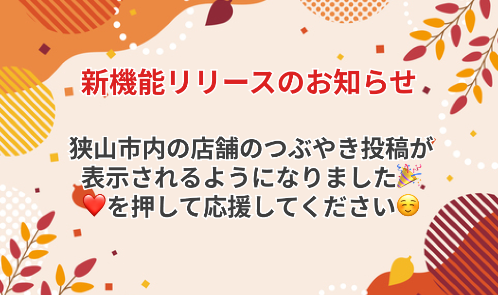 狭山市のニュースの一覧に狭山市内の店舗のつぶやき投稿が表示されるようになりました。